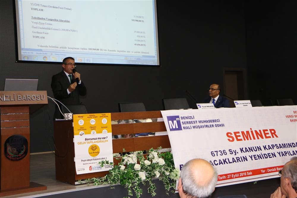 Denizli Vergi Dairesi Başkanlığı ile Denizli Serbest Muhasebeci Mali Müşavirler Odasının birlikte düzenlediği ve kamuoyunda vergi affı olarak bilinen 6736 sayılı BAZI ALACAKLARIN YENİDEN YAPILANDIRLMASINA İLİŞKİN KANUN Hakkındaki seminer Denizli Barosu Toplantı Salonunda yapıldı.
